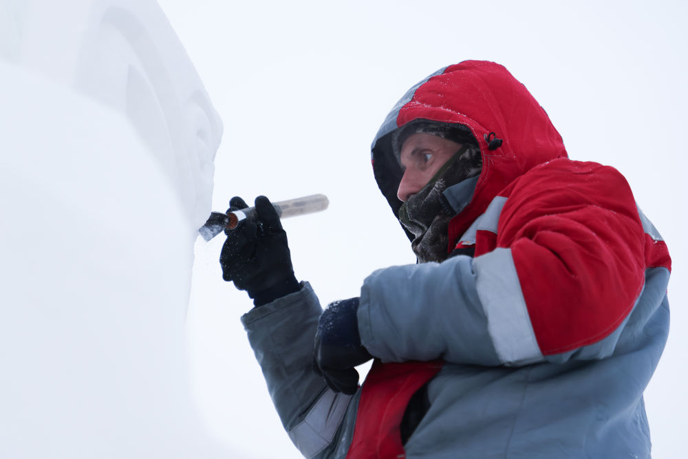 2025年1月10日,来自俄罗斯的雪雕师斯特凡尼娅在制作雪雕。