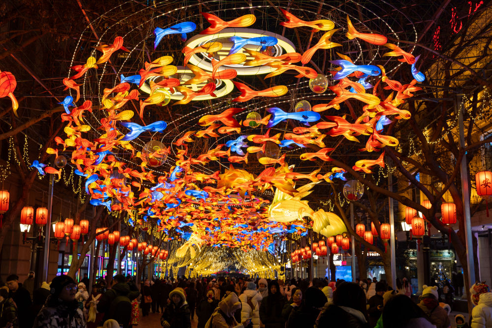 2025年1月10日,人们在哈尔滨人民广场上舞“彩带龙”。