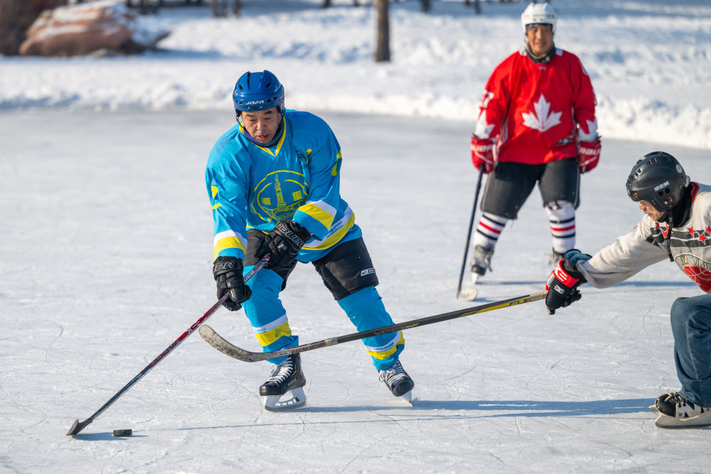 2025年1月11日,孙作新(前右)在丁香公园内和队友打冰球。