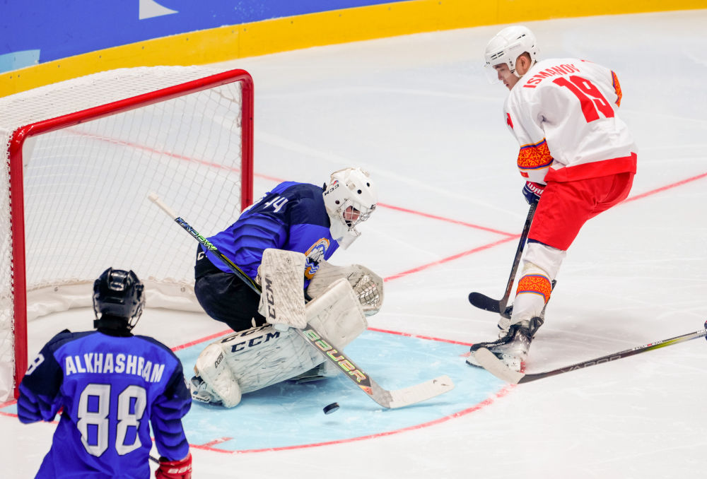 2025年2月3日,在哈尔滨冰球馆举行的哈尔滨2025年亚冬会男子冰球小组赛B组第一轮比赛中,吉尔吉斯斯坦队球员苏丹·伊斯曼诺夫(右)在比赛中进攻。这是第九届亚冬会进行的首场比赛。