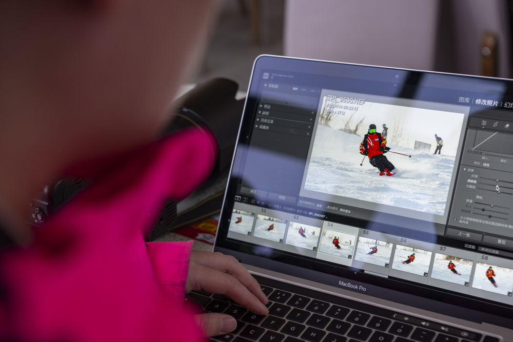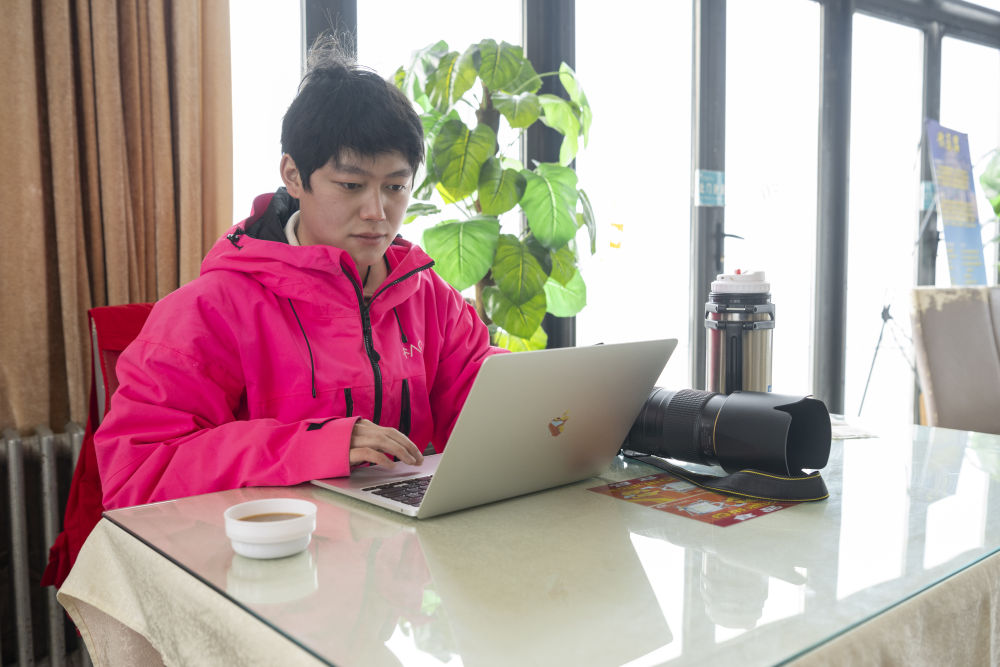 2025年1月15日,单宝源在亚布力阳光滑雪场查看拍摄的照片。