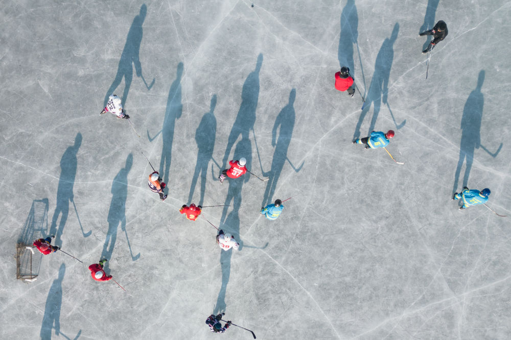 2025年1月11日,道里区老年冰球队球员在哈尔滨丁香公园内打冰球(无人机照片)。