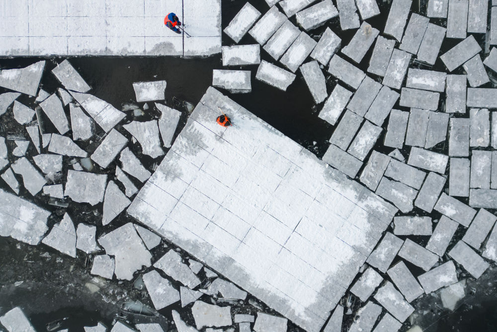 2024年12月9日,工人在松花江哈尔滨段江面第二十六届哈尔滨冰雪大世界采冰现场作业(无人机照片)。