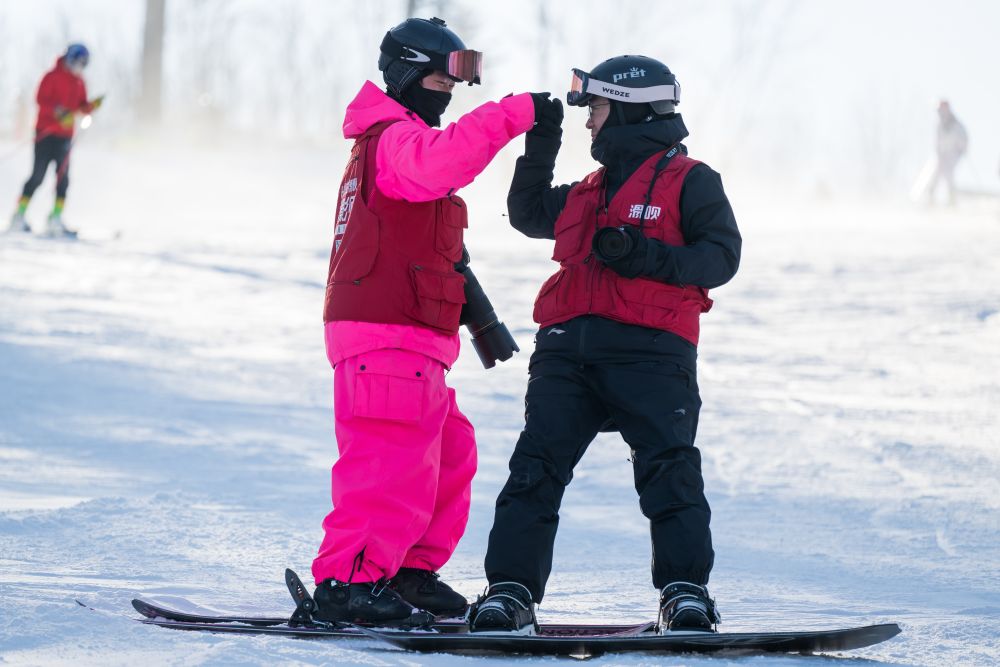 1月15日,单宝源(左)和同事“大蚂蚁”在亚布力阳光滑雪场打招呼。