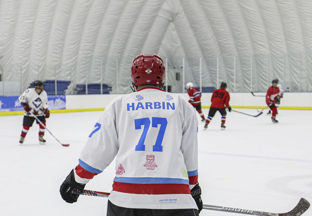 2025年1月17日,孙作新在哈尔滨市道里区冰上运动中心打冰球。