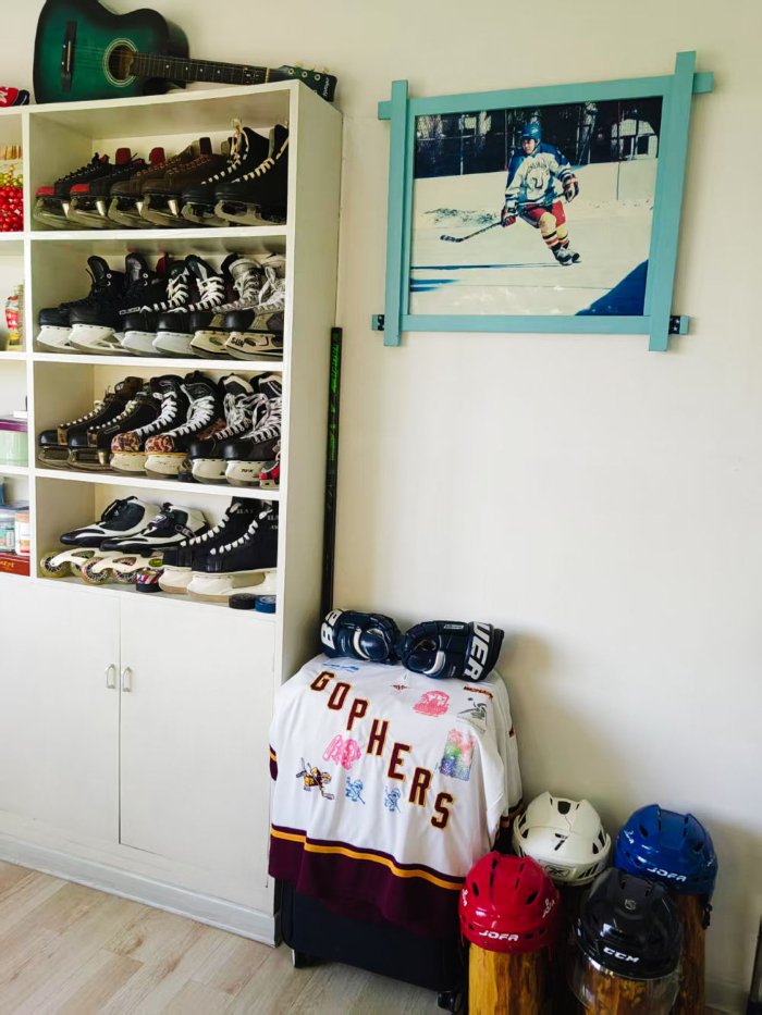 这是孙作新在家中收藏的冰鞋和球衣。受访者供图