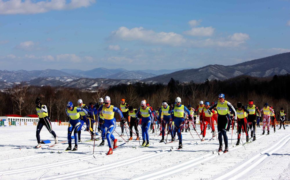 2009年2月27日,参赛选手在第24届世界大学生冬季运动会越野滑雪女子15km传统式集体出发比赛中出发。新华社记者孟永民摄