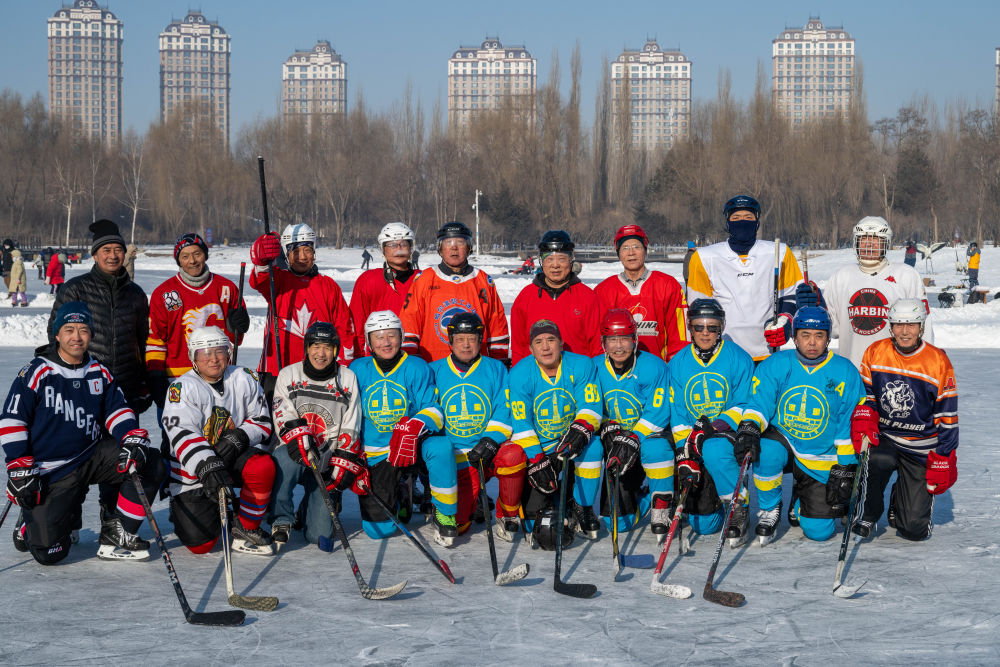 2025年1月11日,道里区老年冰球队成员在哈尔滨丁香公园内合影。