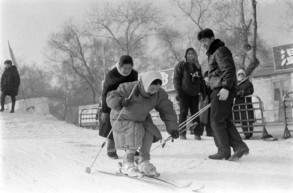 1993年1月19日,青年人在哈尔滨太阳岛滑雪场上滑雪。新华社记者陈凯星摄