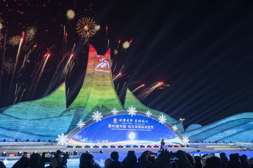 2025年1月5日,在哈尔滨冰雪大世界园区,人们观看第41届中国·哈尔滨国际冰雪节开幕式。