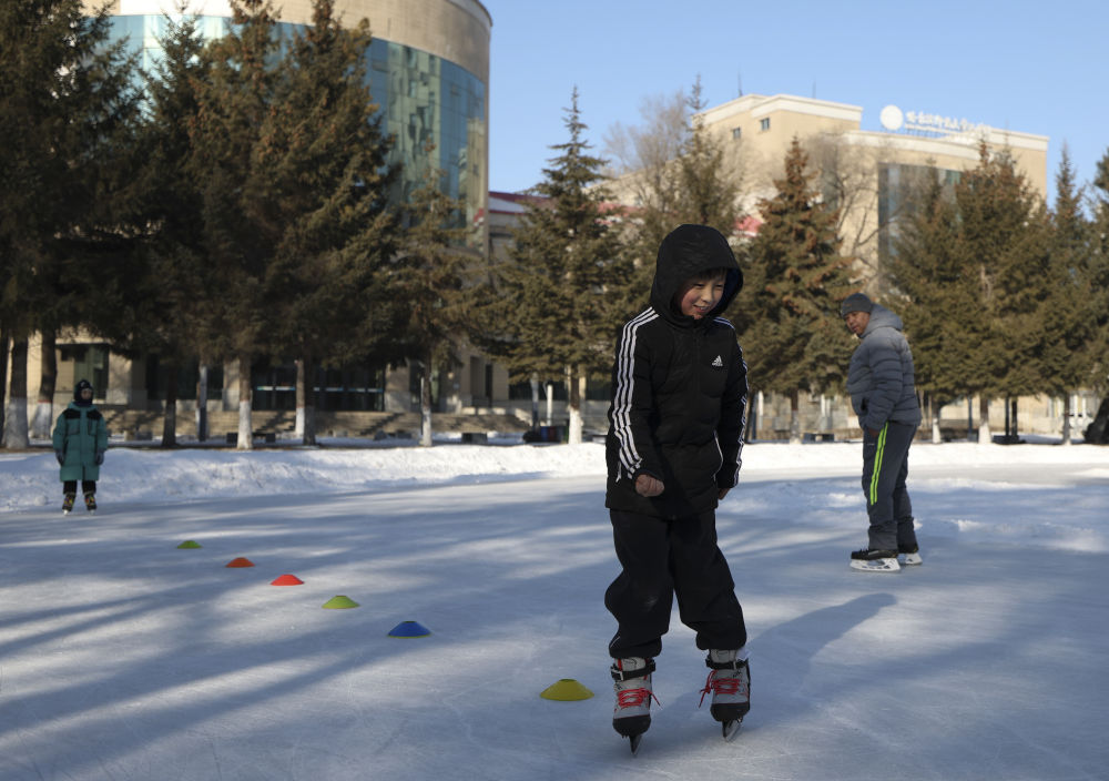2025年1月17日,孙作新(左一)在哈尔滨师范大学校园内的一处冰场教小朋友滑冰。