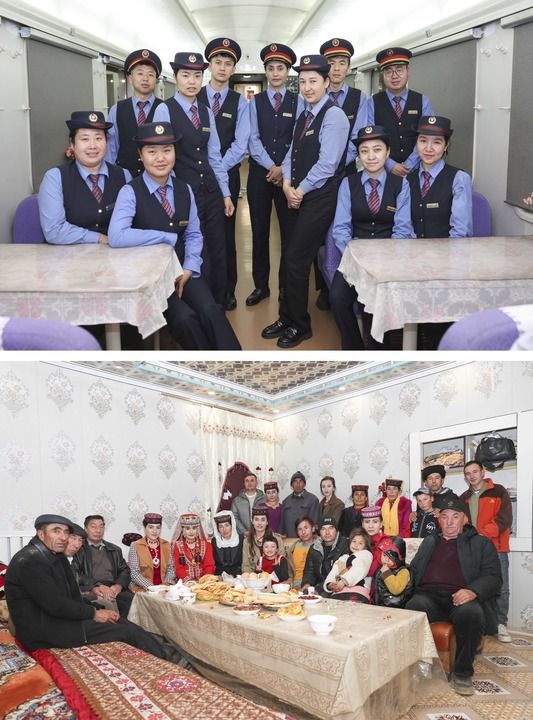 拼版照片:上图为艾尔开牙·多力开(后排左四)与同事们在列车上的合影(2024年4月22日摄);下图为艾尔开牙·多力开(前排左七)回乡探亲时与家人亲戚在家中的大聚会合影(2024年3月22日摄)。