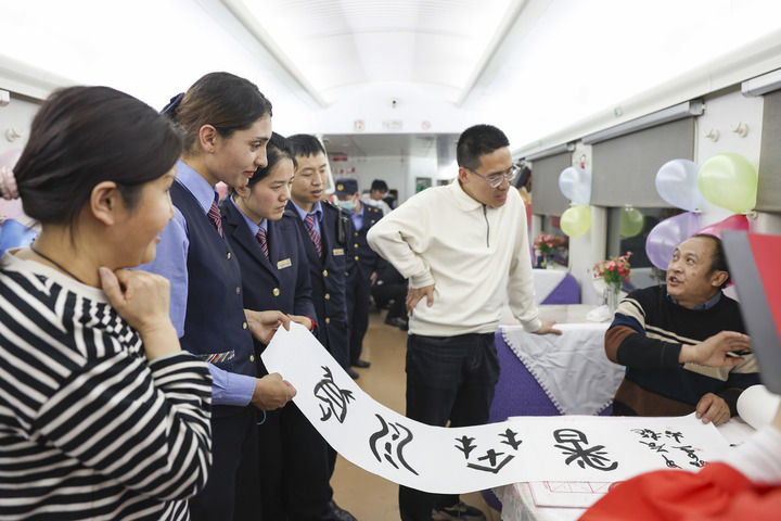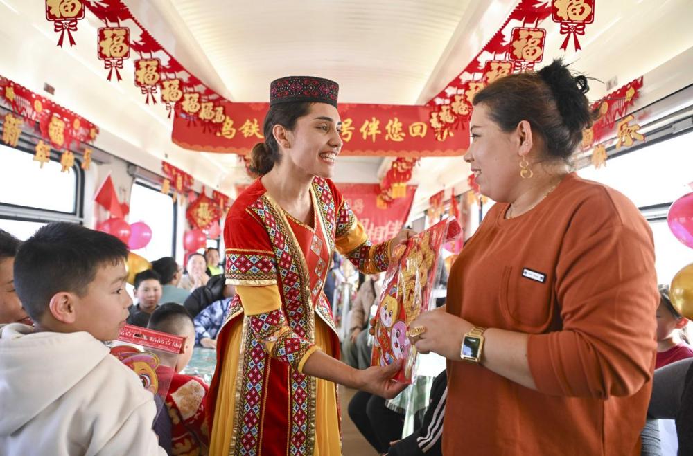 在喀什开往成都西的列车上,艾尔开牙·多力开(左)向参与“列车春晚”互动游戏的乘客赠送福字年画(2025年1月17日摄)。