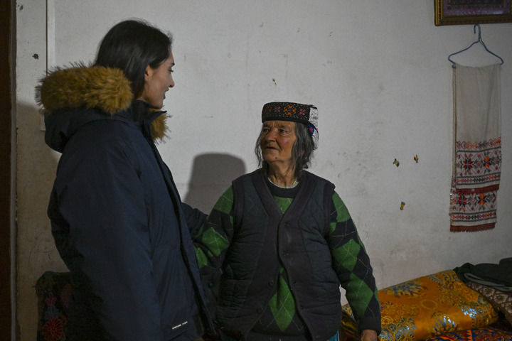 在新疆塔什库尔干塔吉克自治县瓦恰乡夏布孜喀拉村,艾尔开牙·多力开(左)在探亲结束,即将返回工作岗位前夕,向78岁的奶奶辞行(1月4日摄)。新华每日电讯记者 陈朔 摄