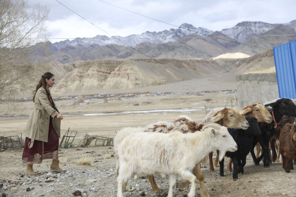 在瓦恰乡夏布孜喀拉村,艾尔开牙·多力开帮忙将羊群赶回羊圈(2024年3月22日摄)。