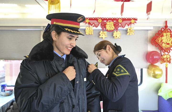 在喀什开往成都西的列车上,“列车春晚”结束后,艾尔开牙·多力开(左)换班当值,同事王彩霞帮她戴好“列车长”袖标(2025年1月17日摄)。
