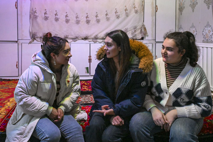 在新疆塔什库尔干塔吉克自治县瓦恰乡夏布孜喀拉村,艾尔开牙·多力开(中)在离家前同妹妹(左)和堂妹在屋内聊天(1月4日摄)。新华社每日电讯记者 陈朔 摄