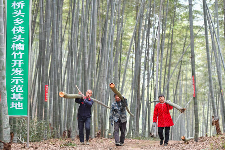 2024年12月10日,在湖南省郴州市桂东县桥头乡侠头村的楠竹开发示范基地,村民在搬运楠竹。新华每日电讯记者 陈泽国 摄