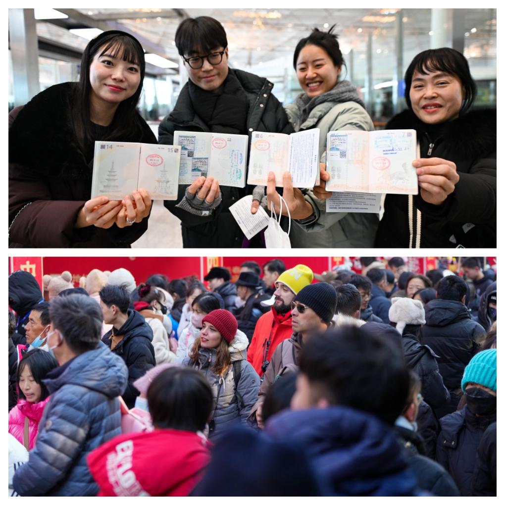 拼图:(上图)1月28日,在首都国际机场,四名韩国游客利用免签政策来中国旅游,他们向记者展示着护照上的入境章。(下图)1月29日,两位来自西班牙的游客在北京地坛庙会游览。