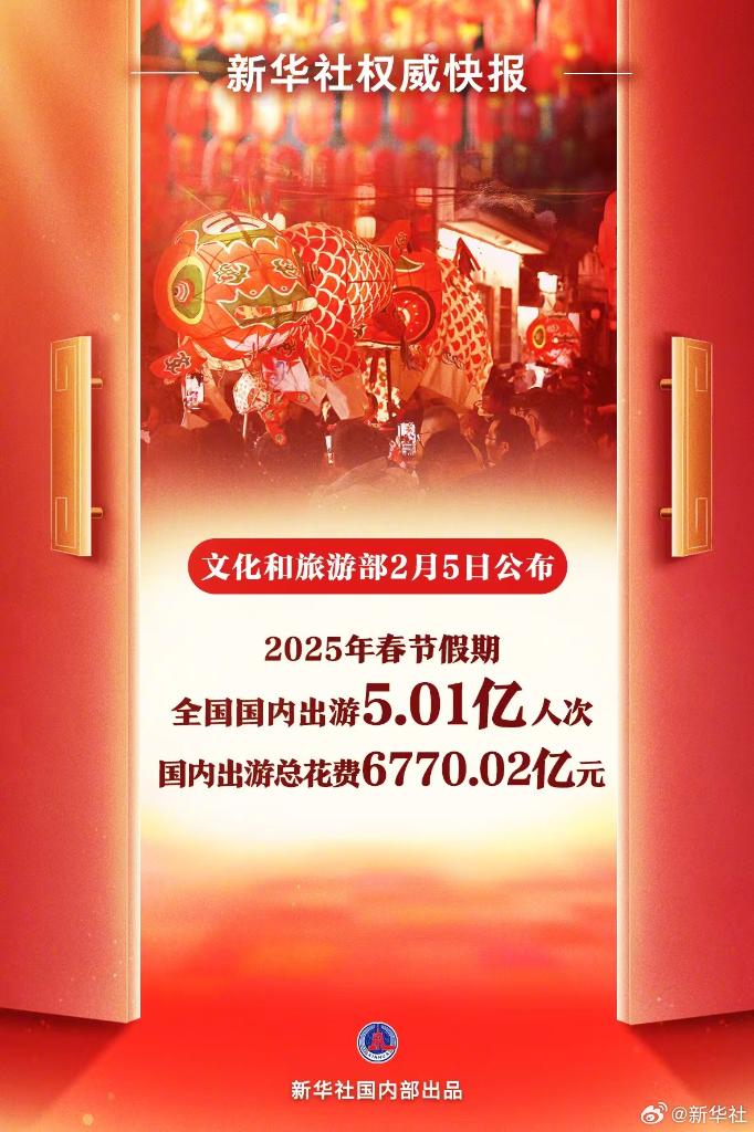 2月5日,文化和旅游部公布春节假期最新数据:春节假期8天,全国国内出游5.01亿人次,同比增长5.9%;国内出游总花费6770.02亿元,同比增长7.0%。全国出游人次和总花费再创新高!