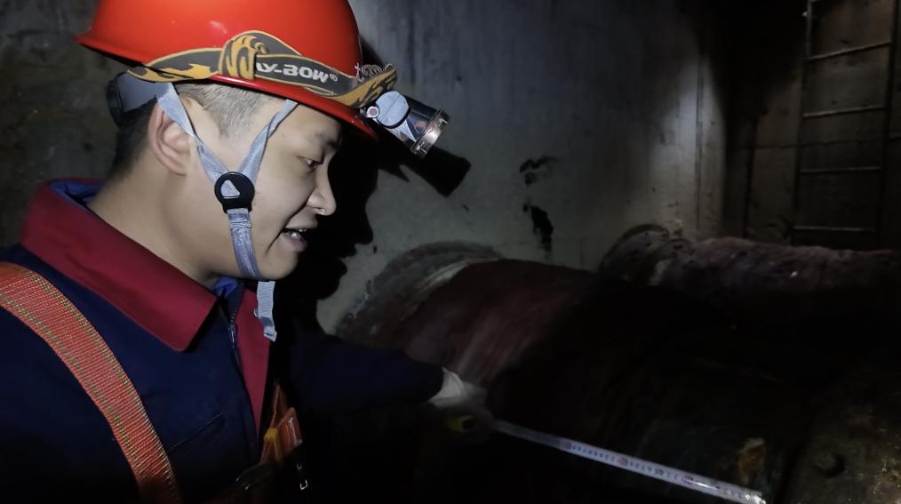 井下空间很黑,走进深处后唯一的光源就是记者头顶上的探照灯,几根超过成年人臂围的管道映入眼帘,温晓亮带着记者重点检查了补偿器的伸缩量,他说:“井下管道热胀冷缩是正常的,但是如果变化过大就容易出现渗漏,补偿器就是用来调节管道变化的装置。”