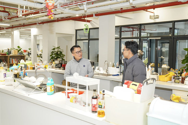 安吉数字游民公社管理员夏雨(左)与在这里工作生活的数字游民交流(2025年1月24日摄)。新华社发(潘学康摄)