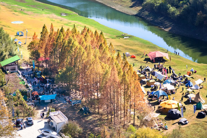 游客在安吉夏阳村的露营地里休闲游玩(2024年11月30日,无人机照片)。新华社发(潘学康摄)