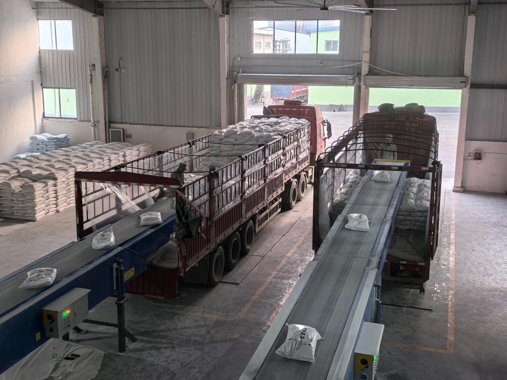 余飞的包装生产线正月初七就开工了,记者在厂区内看到,三辆卡车在等待出货,车间内,一袋袋的糯米粉被传送带运送出来。