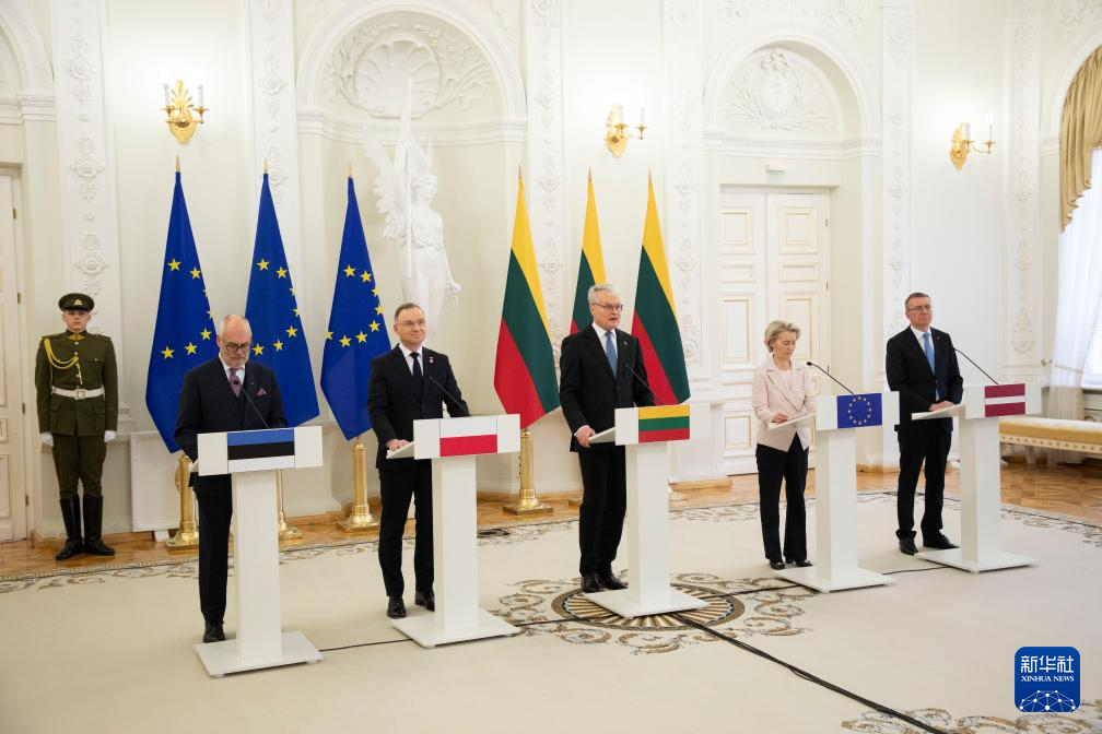 2月9日,在立陶宛首都维尔纽斯,立陶宛总统瑙塞达(中)、拉脱维亚总统林克维奇斯(右一)、爱沙尼亚总统卡里斯、波兰总统杜达(左二)和欧盟委员会主席冯德莱恩(右二)共同出席记者会。新华社发