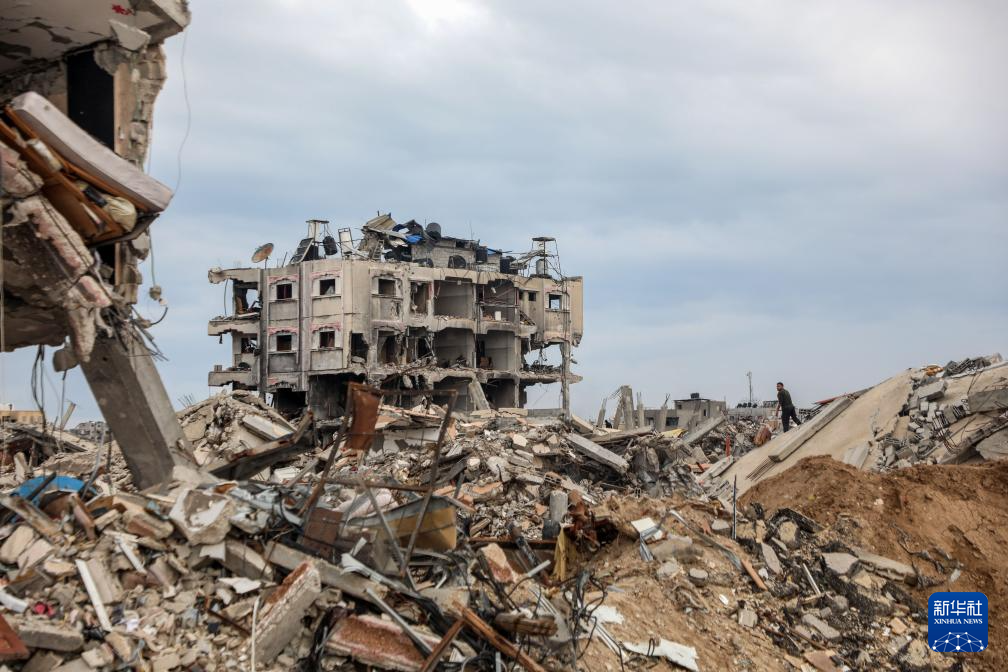 2月9日,在加沙地带内察里姆走廊附近,巴勒斯坦人经过建筑废墟。新华社发(里泽克·阿卜杜勒贾瓦德摄)