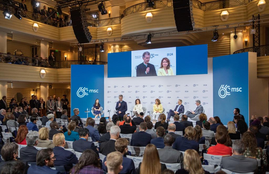 2024年2月18日,慕安会主席克里斯托夫·霍伊斯根(中左二)在德国慕尼黑举行的第60届慕尼黑安全会议上发表闭幕致辞。新华社记者 张帆 摄
