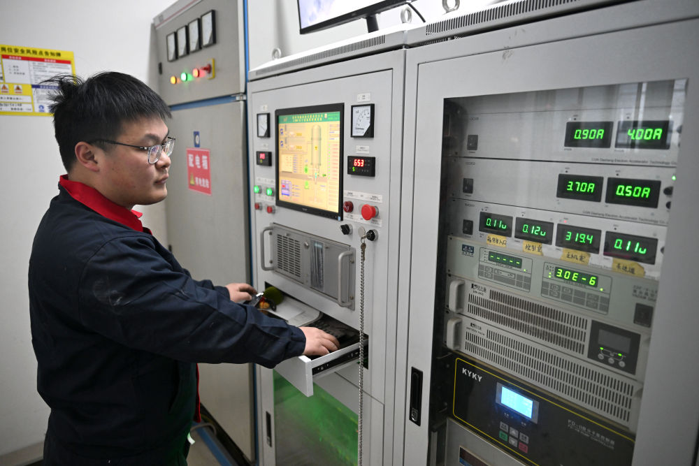 1月8日,在河南省科学院(沁阳)科创园,焦作同辐科技有限责任公司工作人员查看电子加速器系统运行状态。新华社记者 李嘉南 摄
