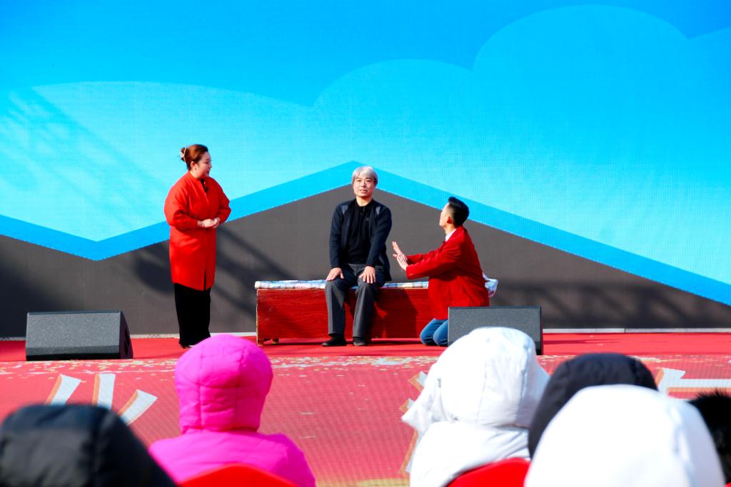 2月11日,在沾化区体育馆前的舞台上,几名演员正在表演渔鼓戏。新华社记者高天 摄