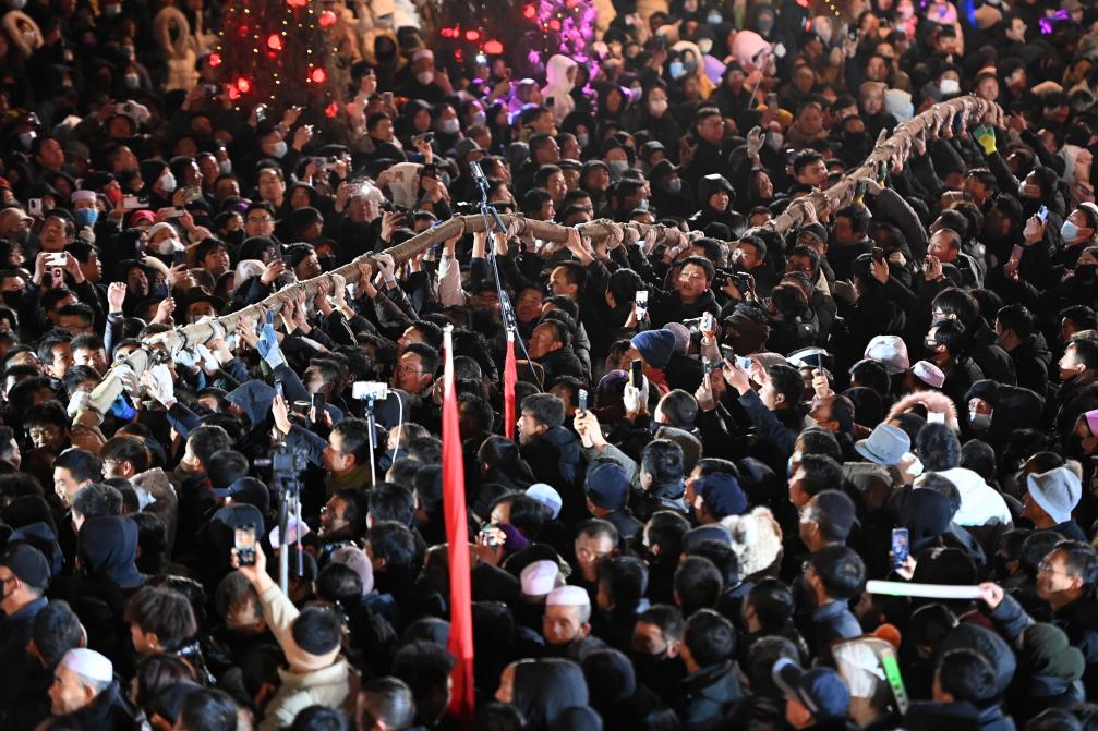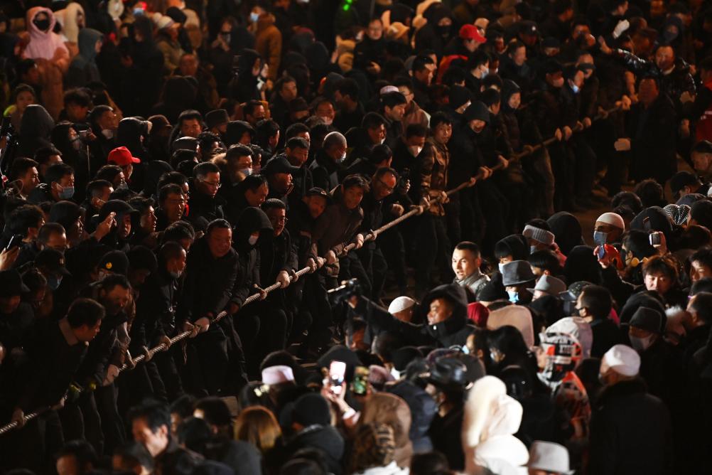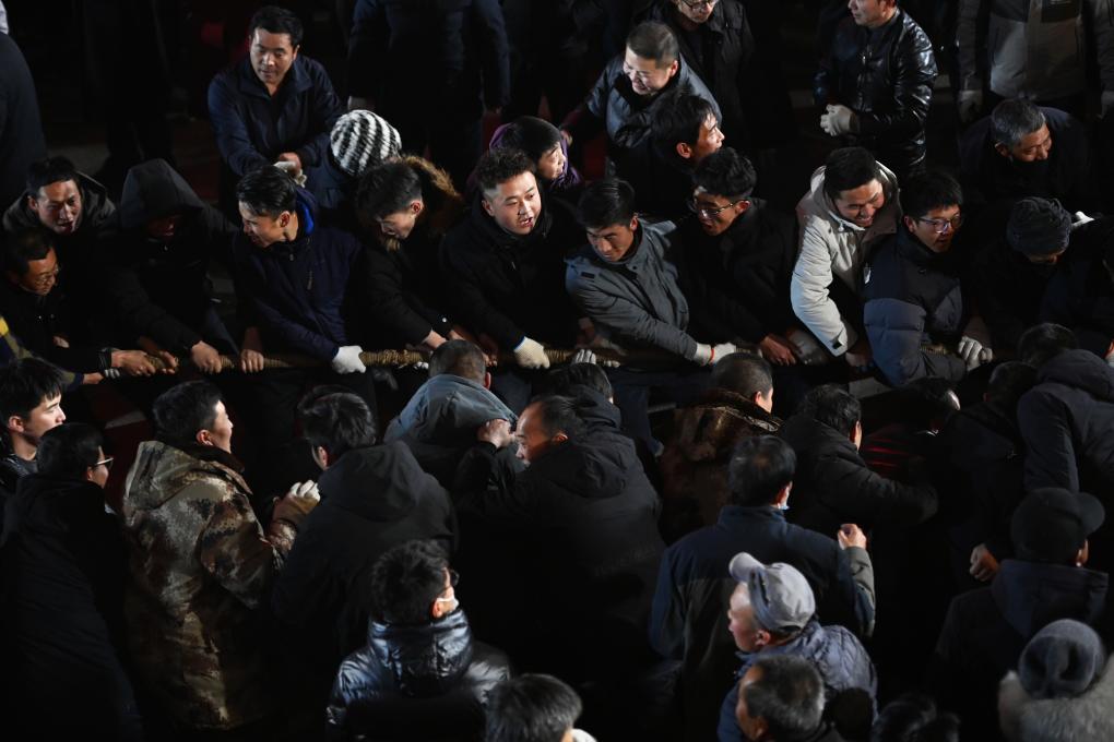 2月11日,在临潭县城关镇西大街,群众参加万人扯绳民俗活动。新华社记者 范培珅 摄