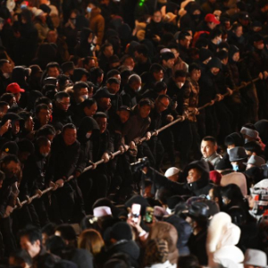 入夜,气温虽已降至零下十摄氏度左右,仍有群众向绳头处聚集。晚上9时许,比赛开始,参赛者迅速自发分成两队,分握绳的两端,双方联手将桦木杠子楔入绳头中央,以鸣炮为号,开始角逐。