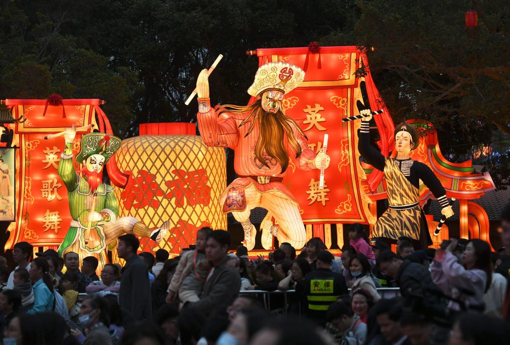 观众在粤港澳大湾区灯会上欣赏英歌舞主题花灯。新华社发(许建梅摄)