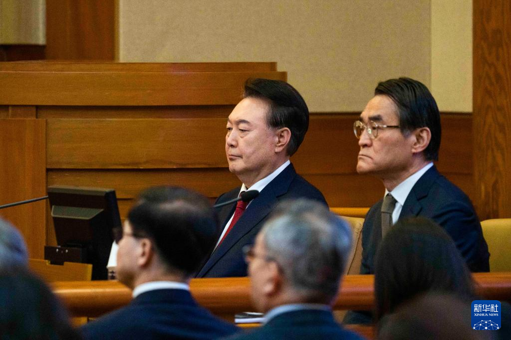 2月11日,尹锡悦(上左)在韩国首尔宪法法院出席总统弹劾案庭审。新华社发(Pool图片,韩振拓摄)