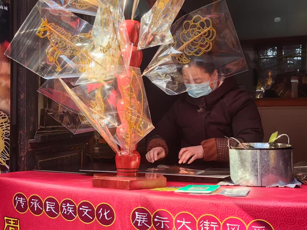 周村古商城的一间糖画铺里,糖画师傅正在用糖汁作画。新华社记者陈国峰 摄