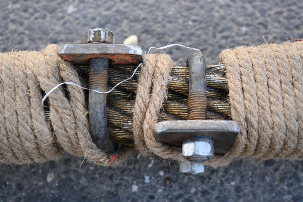 记者看到,钢绳两侧各由三部分组成。第一部分由4股直径约为3厘米的钢绳缠绕组合而成,第二部分则由2股钢绳缠绕组合而成,直到第三部分分为两根互不缠绕的钢绳。
