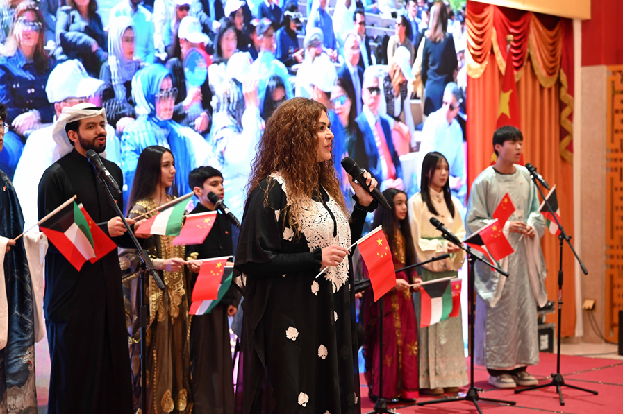 2月12日,在科威特哈瓦利省,中科两国年轻人在活动中演唱歌曲。新华社发(阿萨德 摄)