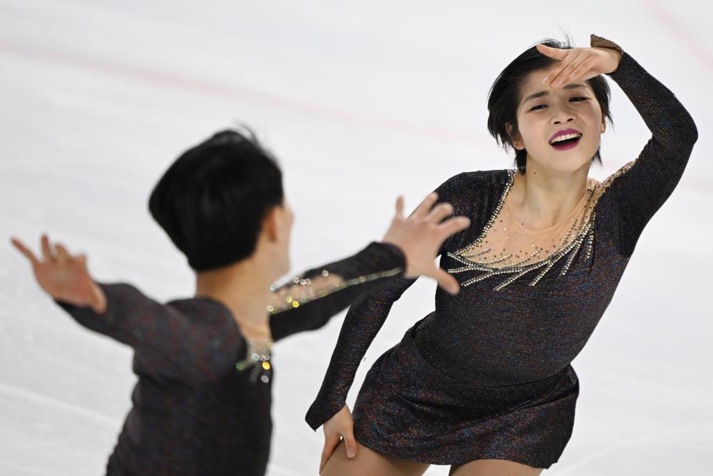 2月12日,朝鲜组合廉太钰(右)/韩锦澈在比赛中。新华社记者 李紫恒 摄