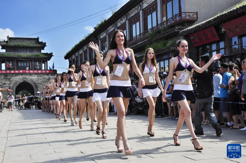 2011年8月16日,首届中国(葫芦岛·兴城)国际泳装文化节中参赛的中外模特走进兴城古城。新华社发
