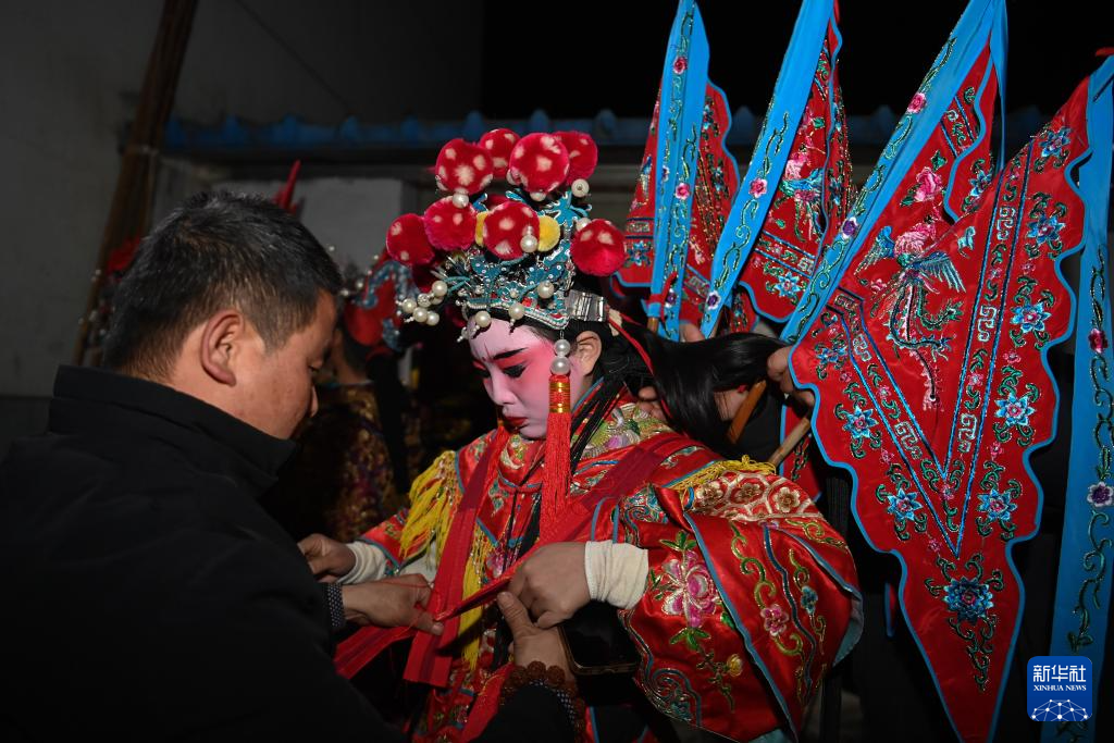 2月11日凌晨,村民为黄花峪村社火队成员穿戴演出服饰。