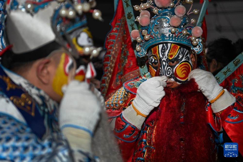 2月11日凌晨,黄花峪村的脸谱手艺人为社火队成员绘制脸谱。
