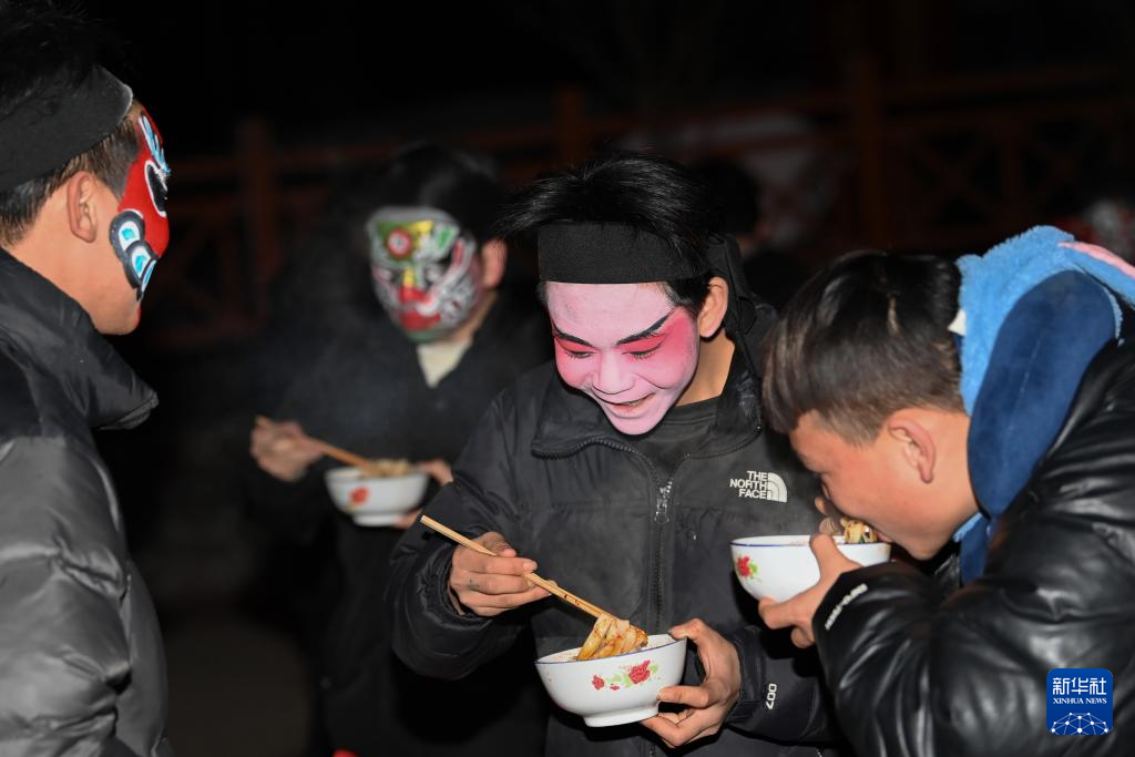 2月11日凌晨,黄花峪村社火队成员在吃早餐。