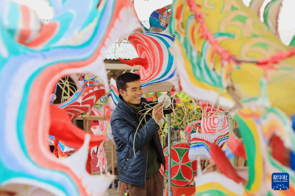 在施秉县城关镇东门社区,民间艺人雷邦阳在制作龙头(1月16日摄)。