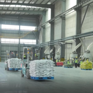 2025年2月9日,内蒙古宁城星美科技有限公司猫砂生产车间内,工人正在进行运输作业。(单德志 摄)