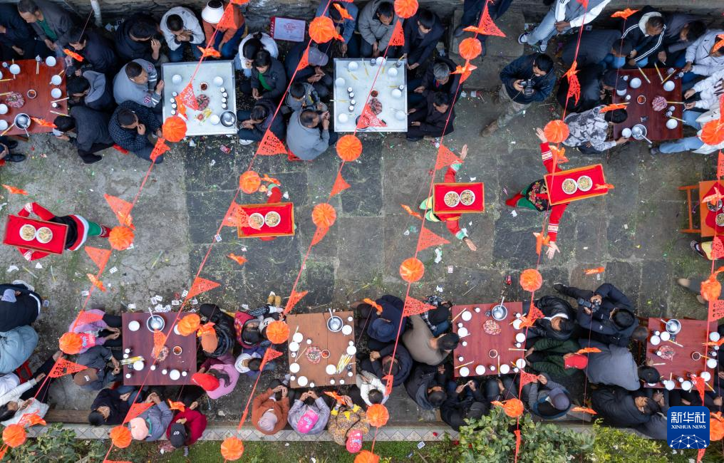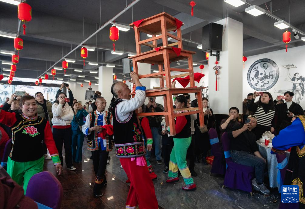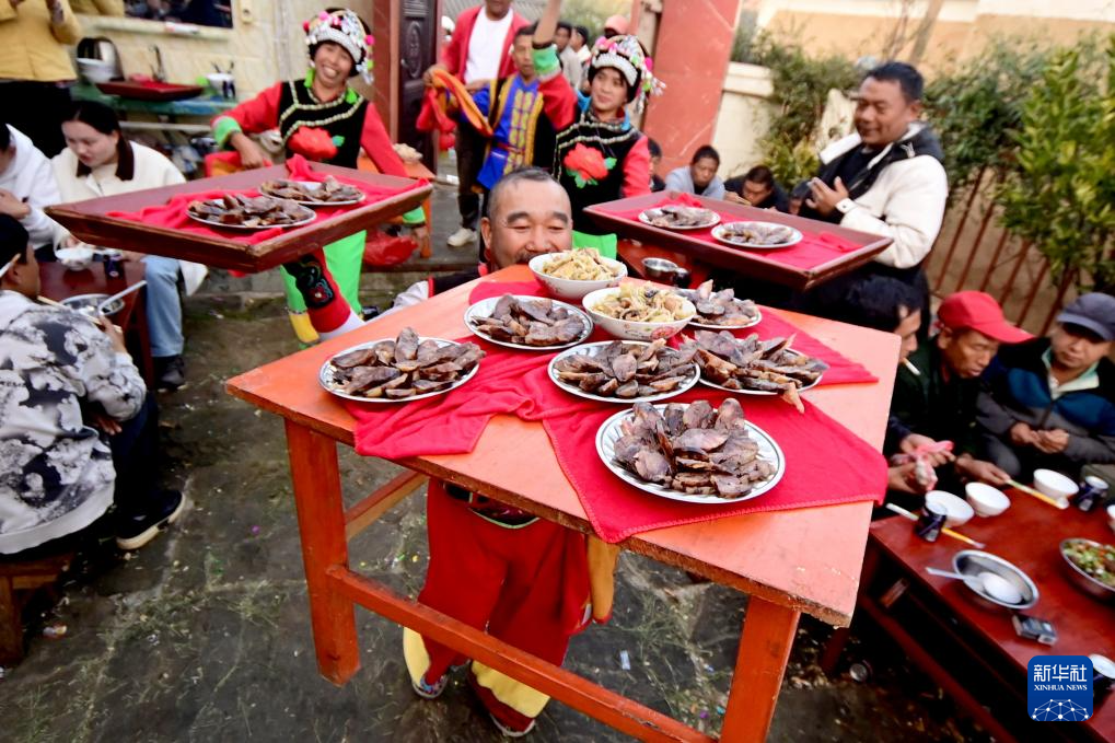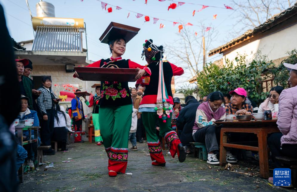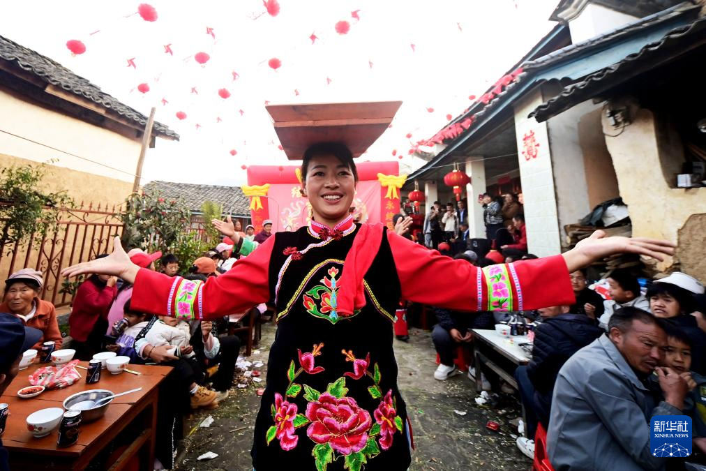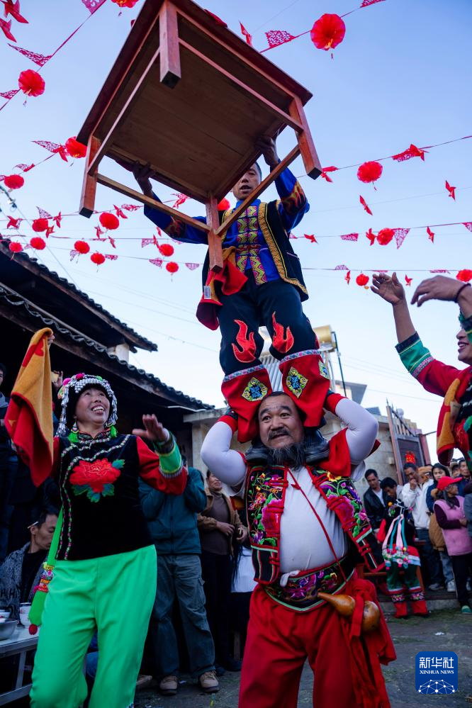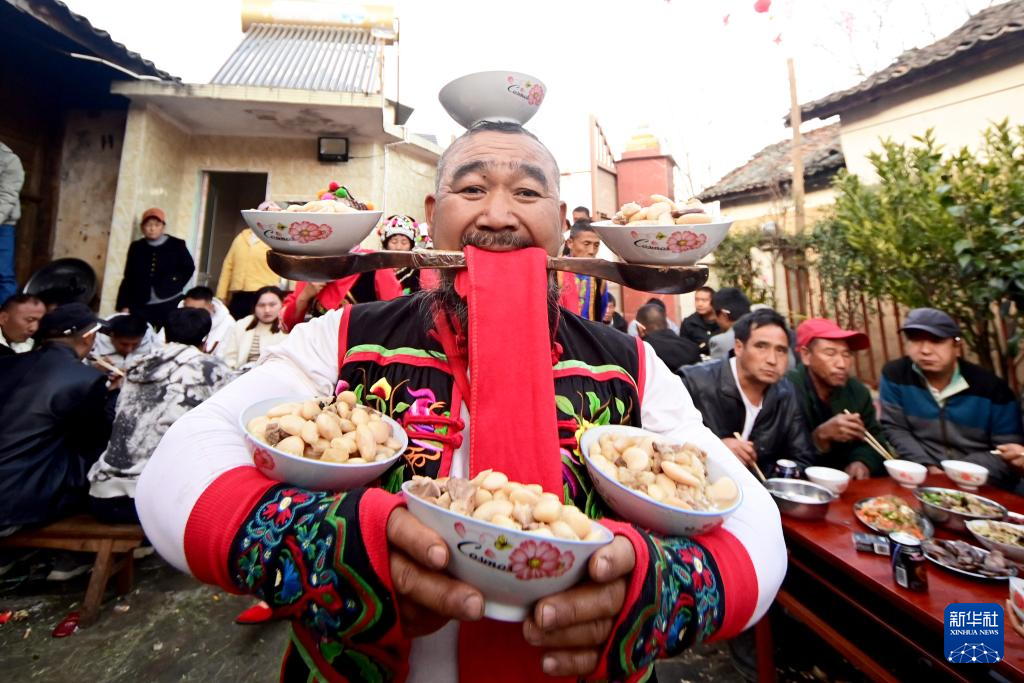 新春的云南省大理白族自治州南涧彝族自治县热闹非凡。当地村民在火红的灯笼下摆开宴席,随着锣鼓、唢呐声响起,跳菜表演者头顶托盘、口咬桌角、三翻三转……在乐声中腾挪跳跃,将彝家美食送上餐桌。