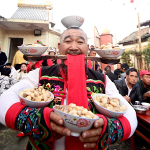2月7日,在南涧县宝华镇拥政村,跳菜表演者在进行口功上菜表演。
