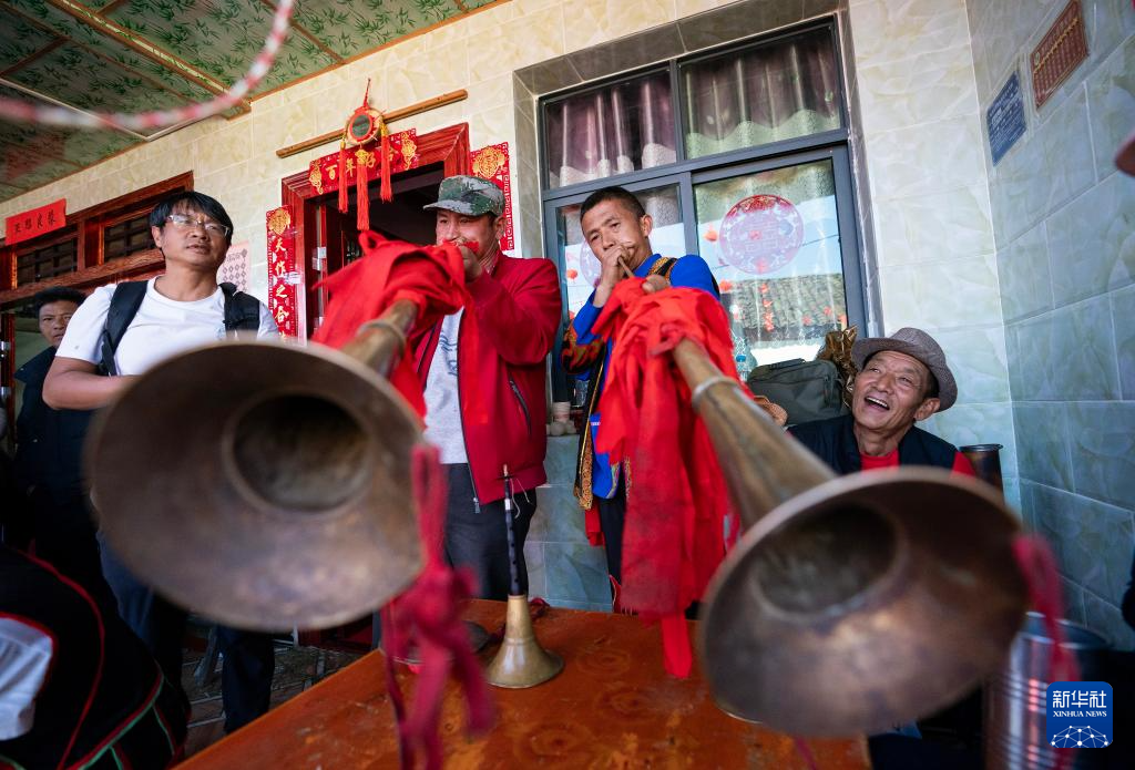 2月7日,乐手在南涧县宝华镇拥政村一农户家的婚礼跳菜上吹奏乐器。